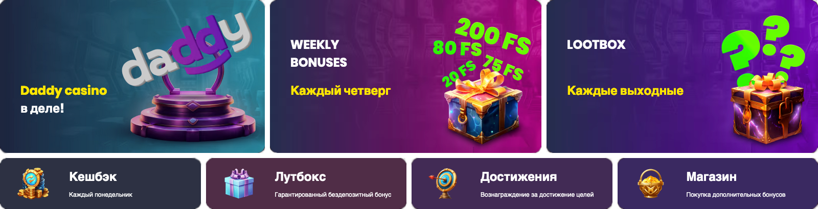 Дополнительные бонусные награды в Дэдди casino геймерам выдают по специальным промокодам. Получить их можно в E-mail или самостоятельно отыскав в Телеграмм-канале клуба.